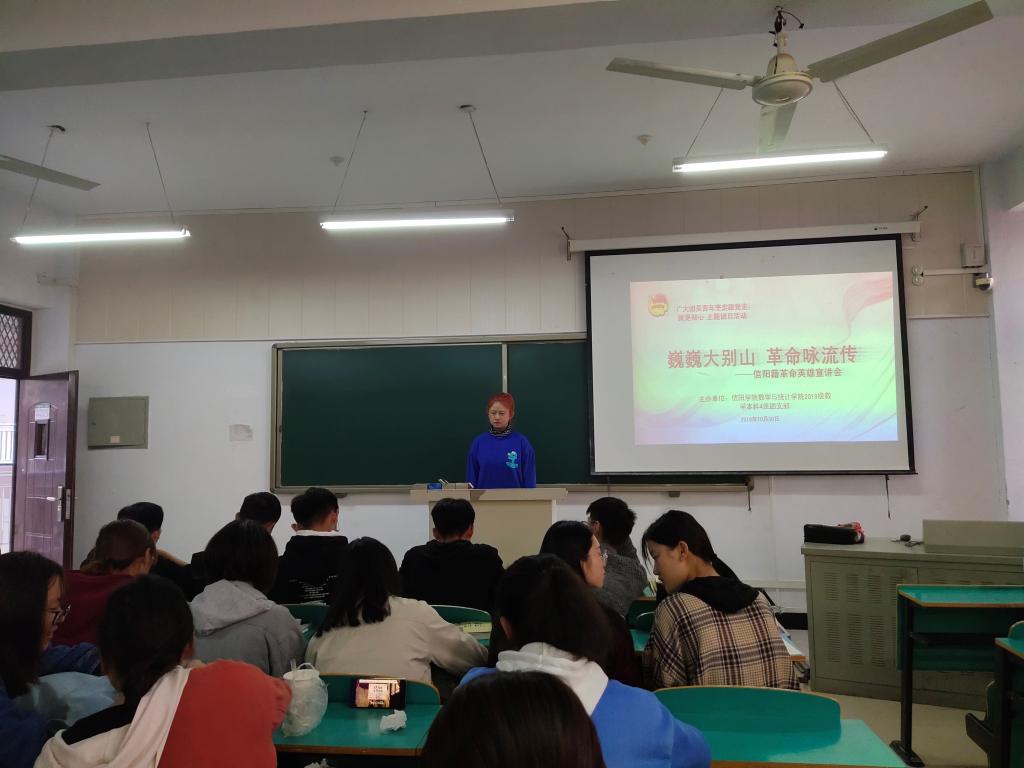 为深入学习贯彻习近平新时代中国特色社会主义思想,贯彻党的十九大精神,落实习近平总书记视察河南的重要讲话精神,引导和帮助我院广大团员青年学生自觉将青年大学习活动内化于心、外化于行。2019年10月30日,数学与统计学院2019级数学本科四班全体同学在数计楼309教室进行以“巍巍大别山,革命咏流传”为主题举行了信阳籍英雄事迹宣讲会。