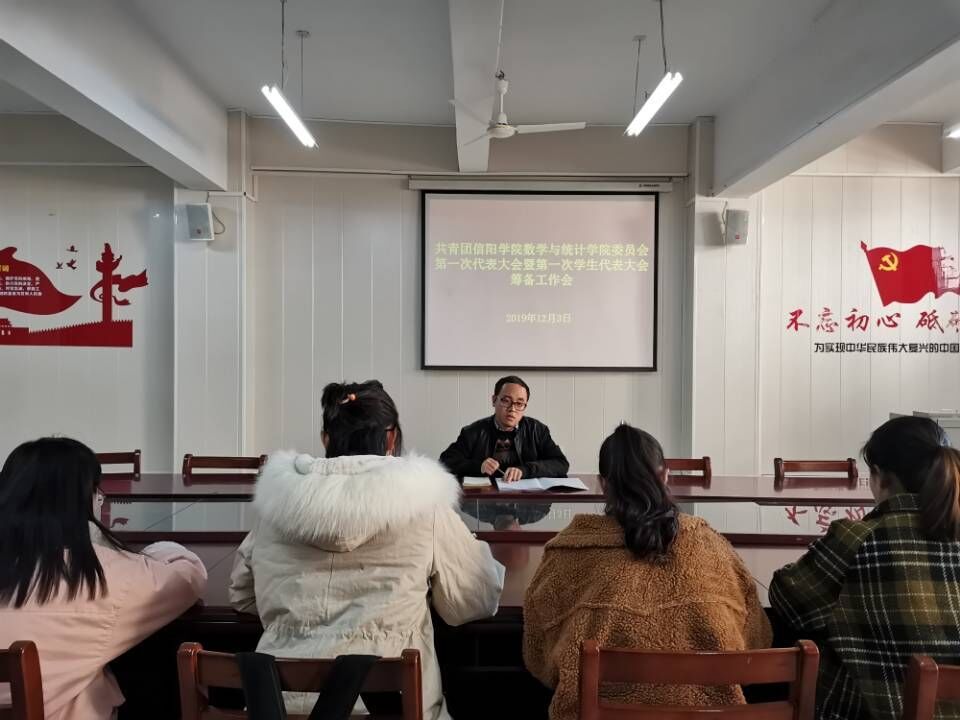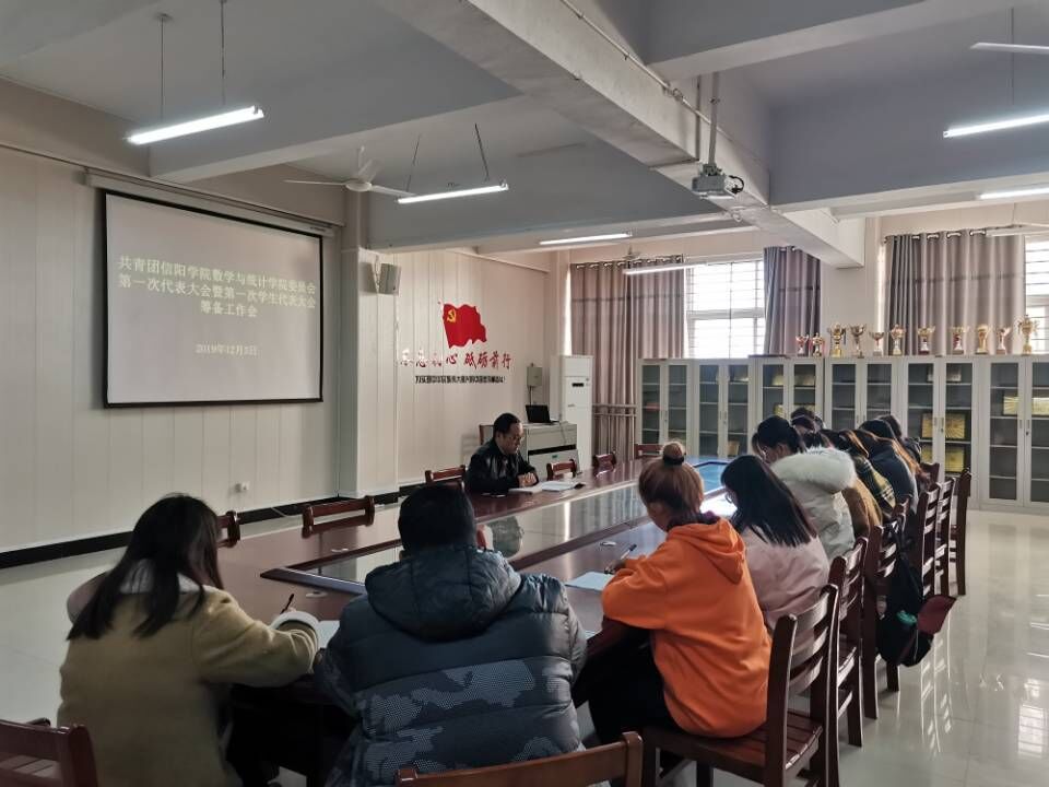 为坚持以习近平新时代中国特色社会主义思想为指导,深入贯彻落实党的十九大精神、团的十八大精神,进一步推进共青团改革和学生会改革,落实校团委关于召开共青团信阳学院第一次代表大会暨第一次学生代表大会的指示精神,数学与统计学院在共青团信阳学院第一次代表大会暨第一次学生代表大会即将开幕之际,于2019年12月3日中午在数计楼407会议室召开了本次大会的筹备工作会。院团总支书记朱纪诚、学生会主要成员及普通团员代表参加了会议。