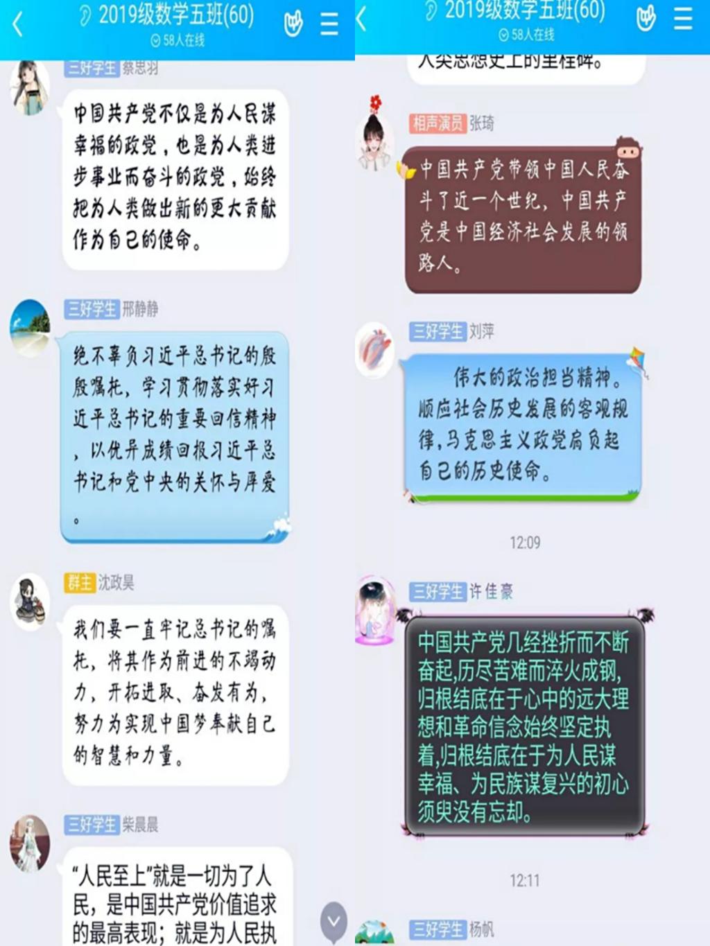 更有部分同学诵读了习近平总书记的主题讲话,并拍摄成视频,这种学习形式更加增强了学习活动的吸引力和感染力。同学们表示,我们要牢记习近平总书记的嘱托,坚定理想信念,坚守共产党人精神追求,不断拼搏创新,要结合学习党史、新中国史、改革开放史、社会主义发展史;认真学习马克思主义理论,在学懂弄通做实上持续下功夫,以理论为实践导航,脚踏实地奋斗,勇担时代重任。