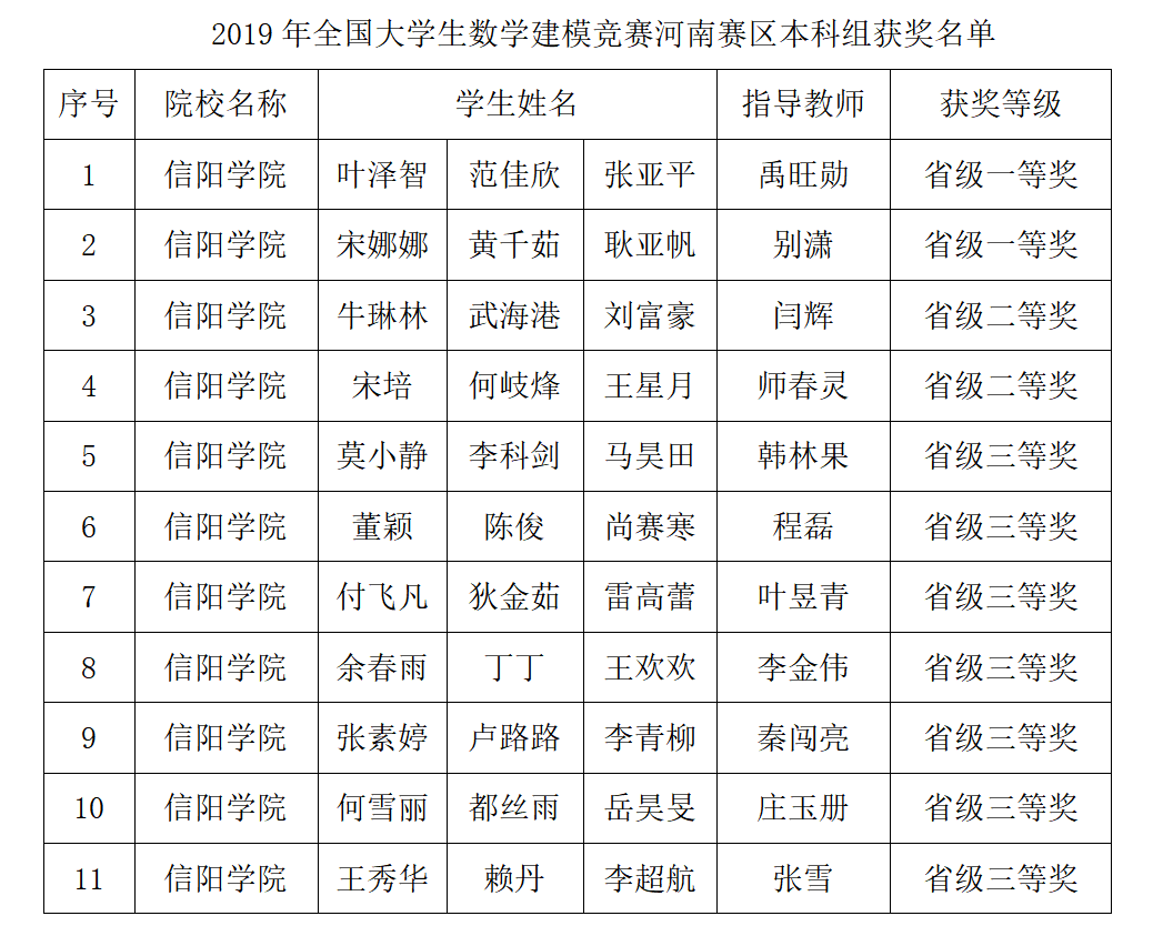 近日,由教育部高等教育司、中国工业与应用数学学会主办的2019年“高教社杯”全国大学生数学建模竞赛成绩揭晓。我校此次选派的21支队伍参赛,经过三天三夜的刻苦钻研、团结协作,喜获河南省赛区一等奖2项,二等奖2项,三等奖7项。